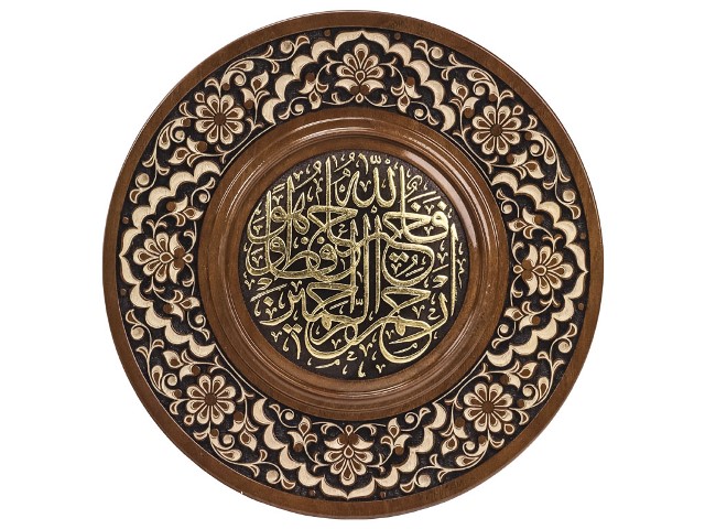 Деревянное панно ручной работы с сурой из Корана.Выполнено из благородного сорта грецкого ореха. Древисину сушат от 5 до 6 лет при определенных условиях. Декорировано золочением. Диаметр панно - 25 см. Авторская работа узбекского мастера-резчика по дереву Шухрата Ахмедназарова.