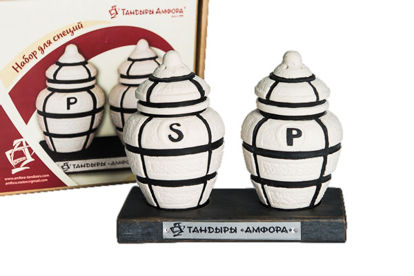 Набор позволит хранить и использовать специи в течение долгого времени без дозаправки. Состоит из 2-х банок высотой 12 см, выполненных в форме тандыра, и удобной подставки.