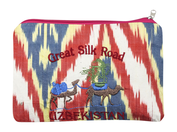 Кошелек с застежкой-молнией из натуральной ткани "адрас" (100% хлопок) с машинной вышивкой. Сюжет напоминает об истории Узбекистана, города которого располагались на Великом Шелковом пути. Отличный подарок или сувенир.